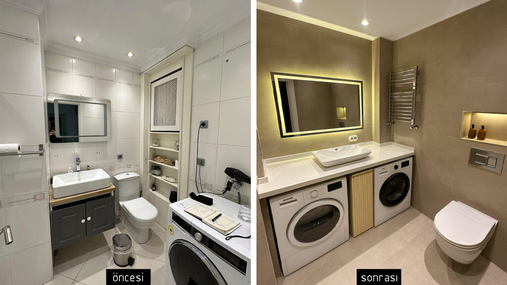 Uygulama aşamasında elektrik ve su tesisatları tamamen yenilenmiş, çamaşır ve kurutma makinelerinin yan yana konumlandırılmasına imkân veren özel üretim mobilya tasarlanmış, imalatı ve montajı gerçekleştirilmiştir. Asma klozet üzerinde estetik bir niş tasarlanmış, mekâna dekoratif bir karakter kazandırılmıştır.