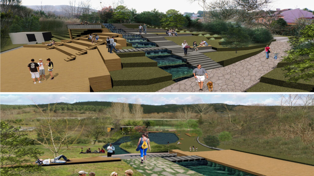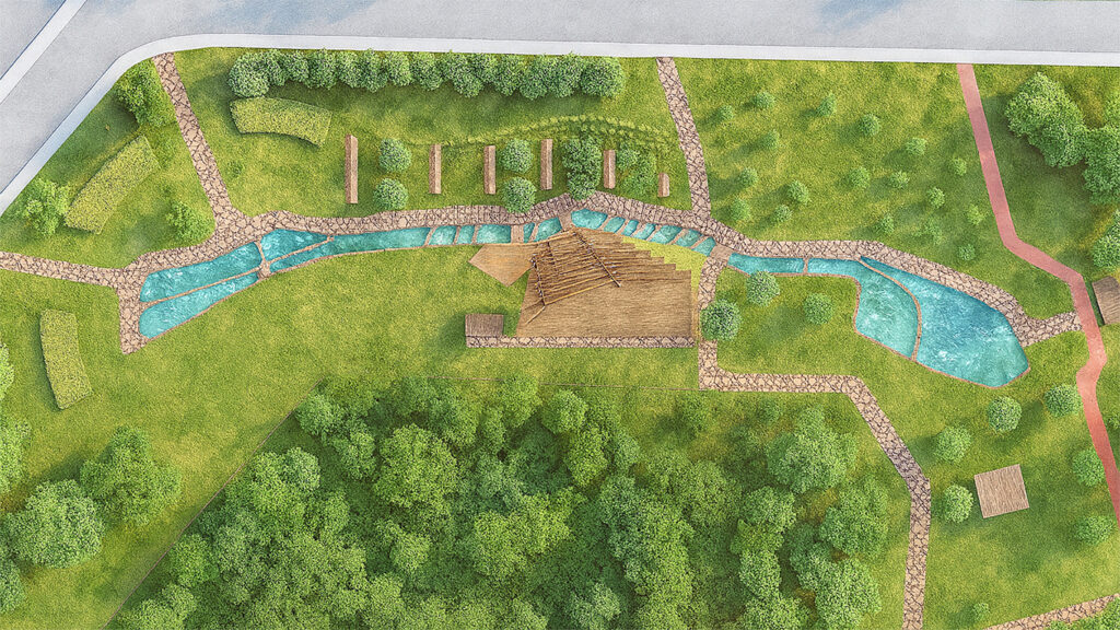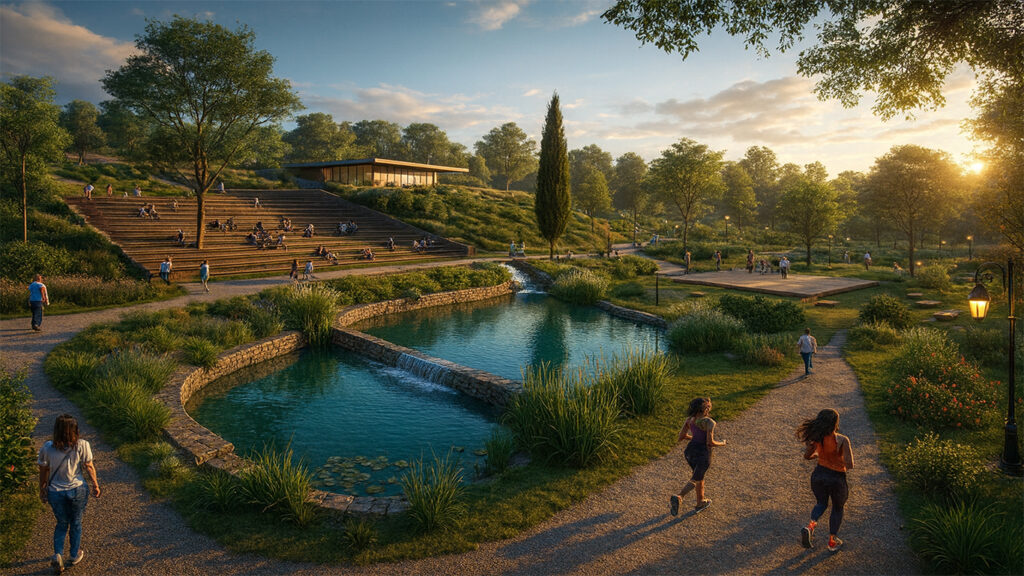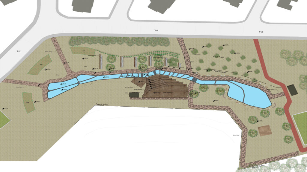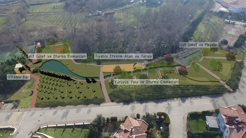 Su ögelerinin çevresinde yürüyüş yolları, oturma alanları ve kot farkından yararlanarak tasarlanan ahşap yüzeyli bir etkinlik alanı yer almaktadır. Bu alan; kademeli oturma sıraları, merdivenler, sahne ve üst kotta yer alan bir seyir deckinden oluşur. Yürüyüş yolu, üst gölet çevresinden başlayarak dere boyunca ilerler, etkinlik alanının yanından geçerek alt gölete ulaşır ve mevcut tartan piste bağlanır. Ayrıca, park içerisinde vitamin bar konseptiyle doğal ve sağlıklı içeceklerin sunulacağı küçük bir kafe ve çeşitli servis alanları da planlanmıştır. Bitkilendirme ve tüm peyzaj tasarımı, kullanıcıların doğayla etkileşim içinde vakit geçirebileceği bir alan oluşturma hedefiyle projeye entegre edilmiştir.