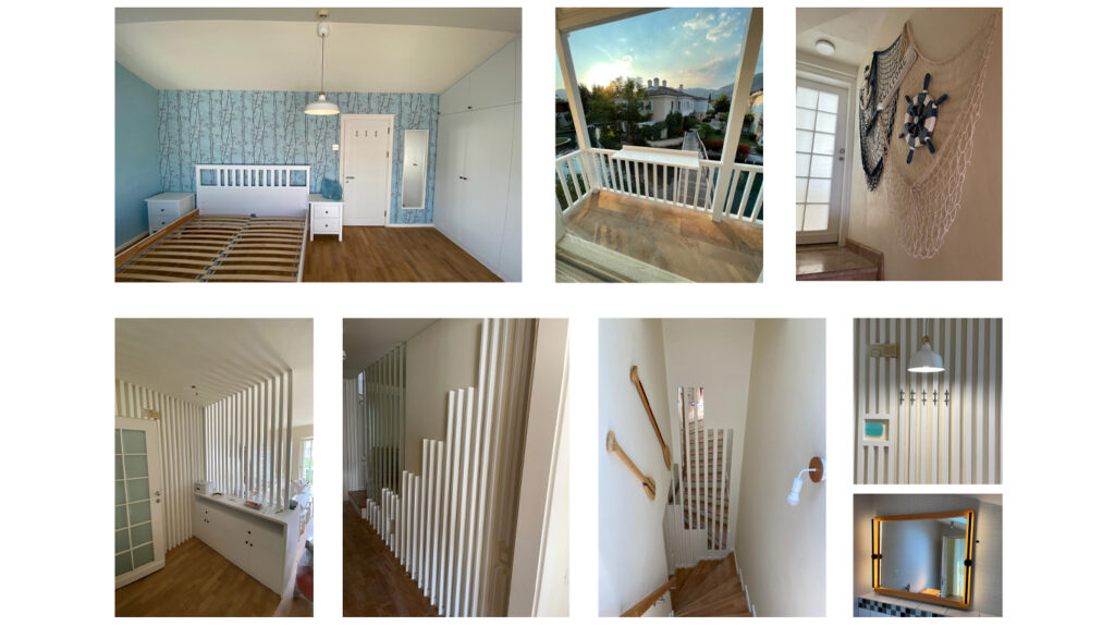 Evin giriş merdiveni boyunca, koç boynuzu ve gemi halatlarından üretilen özel trabzanlar kullanılmış; açık kalan cephe ise parametrik formlu beyaz ahşap dikmelerle güvenli ve estetik bir şekilde kapatılmıştır. Dar koridorları daha ferah göstermek amacıyla, kamaralardan esinlenen yuvarlak aynalar yerleştirilmiştir.
