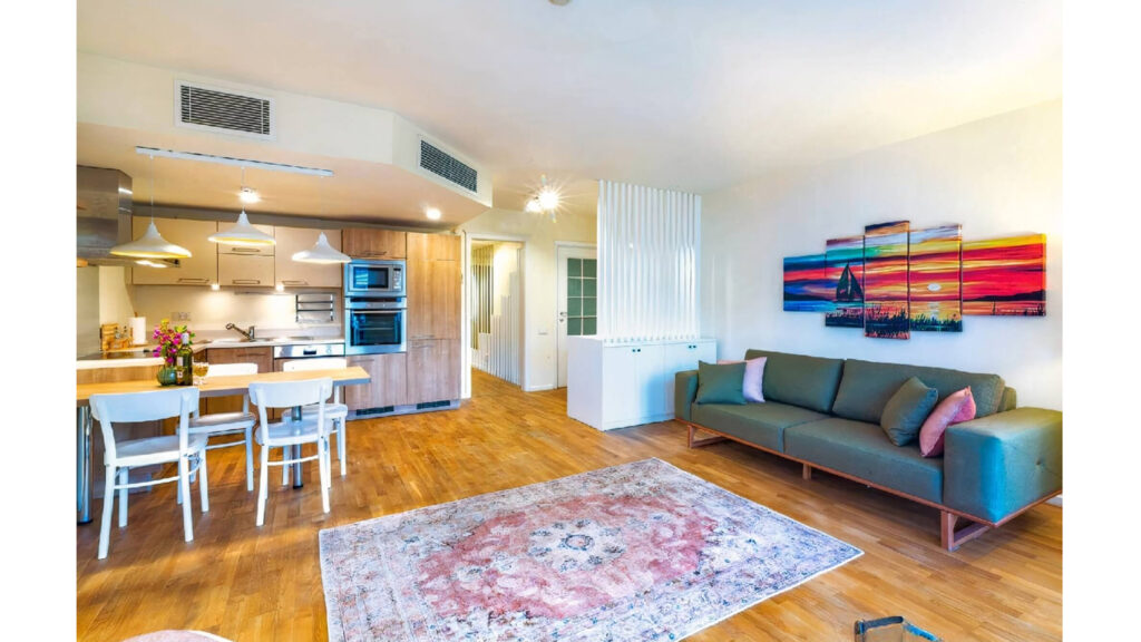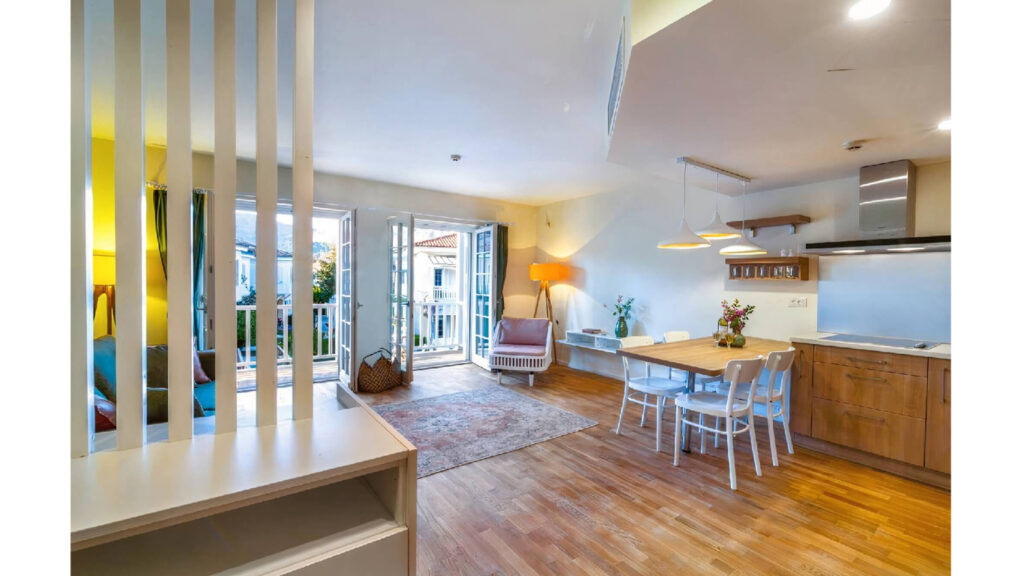 Giriş holünde, duvardan başlayarak devam eden parametrik ahşap dil, özel tasarım bir dresuarla buluşarak salonla giriş arasında yarı geçirgen bir geçiş alanı tanımlamıştır. Bu sayede, evin ana kapısından doğrudan salona geçiş engellenmiş ve daha kontrollü bir giriş deneyimi sağlanmıştır. Balkon içinse, dış cepheyle uyumlu masif ahşap modüler bir tezgâh tasarlanmıştır.
