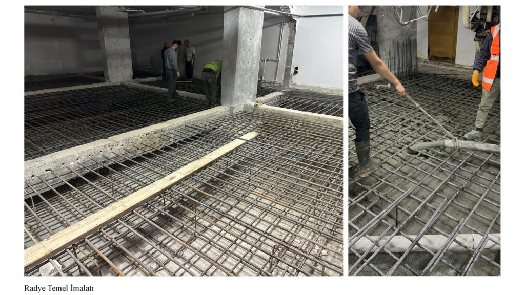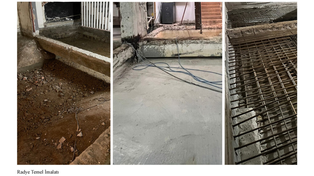 İlk olarak temel sistemi ele alınmış, pabuç ve bağ kirişlerden oluşan mevcut tekil temel, içeriden yapılan kazılarla açılarak radye temel sistemine dönüştürülmüştür. Yeni donatılar yerleştirilmiş ve beton dökümüyle temel güçlendirmesi tamamlanmıştır.