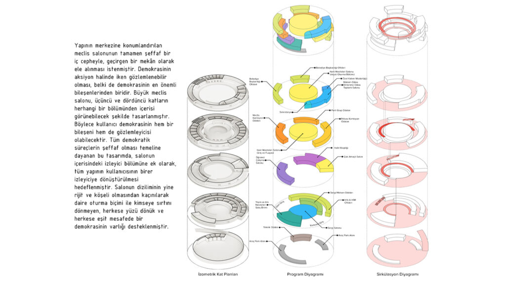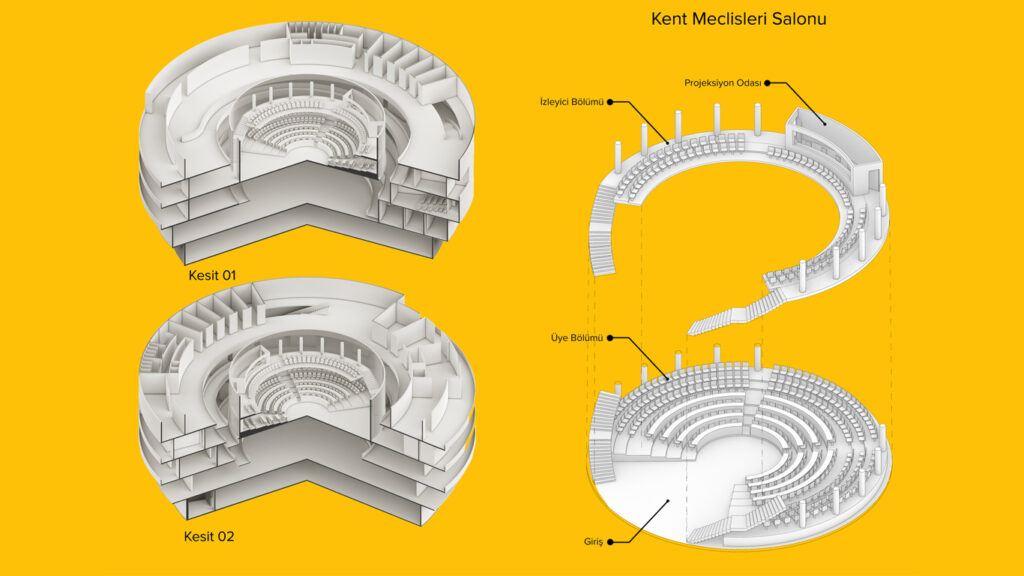 İzmir Büyükşehir Belediyesi “Bir Uygarlık Odağı Olarak Başkanlık ve Şehir Meclisleri” Fikir Projesi Yarışması kapsamında, herkes için erişilebilir ve eşitlikçi bir demokrasi mekânı tasarlanması hedeflenmiştir.